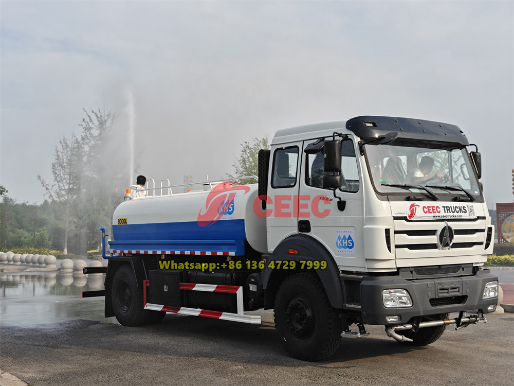 Camión cisterna Beiben 1929, con sistema de rociado frontal y sistema de rociado trasero.