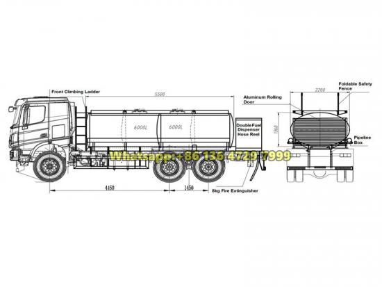 Integra un moderno sistema de repostaje, que incluye dos dispensadores Censtar, cada uno con un caudal de 80 litros por minuto, y una manguera de repostaje retráctil de 15 metros. Entre sus características de seguridad se incluyen tapas de boca de inspección que cumplen con la normativa europea, válvulas de descarga API, dispositivos de recuperación de vapores y sistemas anti-desbordamiento y antiestáticos, que equilibran la eficiencia operativa con la seguridad. La parte superior del tanque está equipada con una plataforma de acceso y una escalera, además de accesorios profesionales como bombas de combustible y cajas de tuberías, lo que la hace idónea para diversos escenarios de repostaje y distribución in situ.