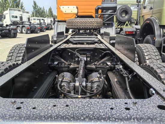 El chasis de doble eje BeiBen es un chasis 6x4 diseñado específicamente para la modificación de camiones volquete de construcción de gran tonelaje. Es reconocido por su fiabilidad y capacidad de carga. Está propulsado por un motor WD615.50 Euro II (290 CV), acoplado a una transmisión sincronizada 9JS150A y un eje reductor de dos etapas con una relación de 5,263. Con una larga distancia entre ejes de 3800+1450 mm y una suspensión de ballestas parabólicas de 13 hojas, garantiza una excelente estabilidad de carga. El chasis es apto para el montaje de una caja de carga de 5600×2300×1500 mm, lo que lo hace ideal para el transporte de minerales y proyectos de construcción.