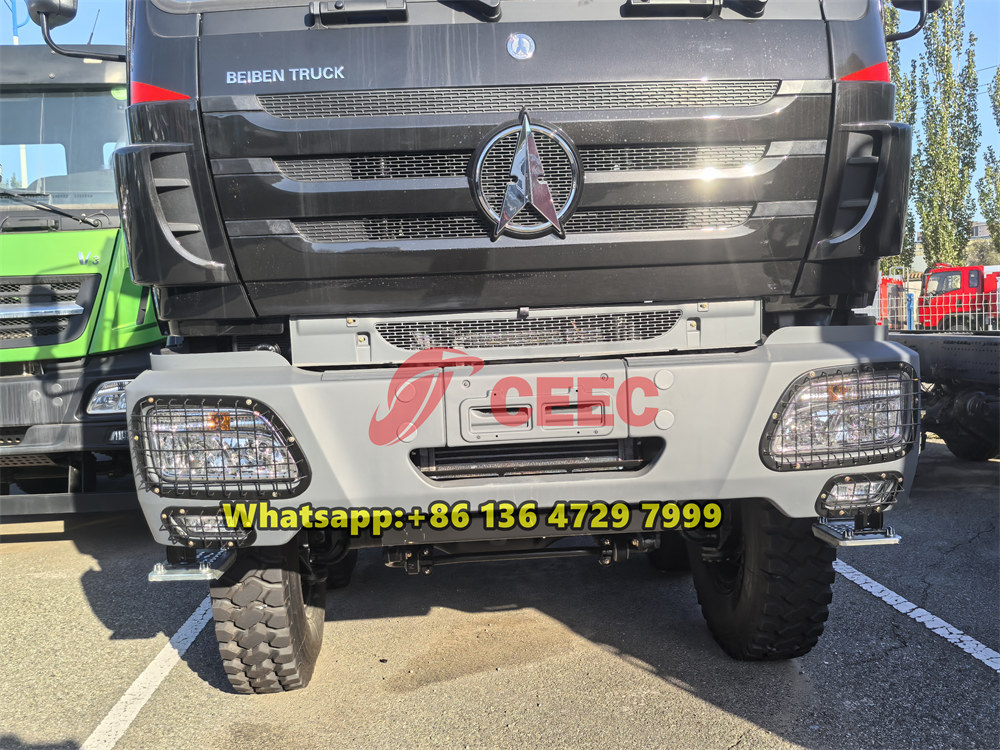 El camión Beiben 3142 con tracción a las 12 ruedas está equipado con tanques de 15,000 litros y válvulas antifugas para la distribución de combustible o agua en comunidades remotas o campamentos mineros. Las características de seguridad incluyen sistemas de extinción de incendios.