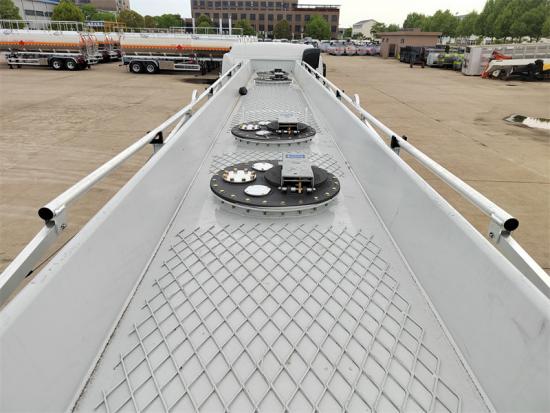 features a large 30,000-liter carbon steel fuel tank, constructed with 6mm thickened plates and intelligently divided into four independent compartments for the simultaneous and safe transport of multiple types of fuel. The operational system is comprehensive and efficient, including European-standard aluminum alloy manhole covers, aluminum alloy bottom valves, and a fuel pump with a flow rate of 60 m³/h. Coupled with two 4-inch diameter unloading rubber hoses, it significantly enhances the speed and convenience of fuel transfer operations. The tank top is equipped with an anti-slip walkway, reflecting a design that balances high operational efficiency with comprehensive safety compliance.